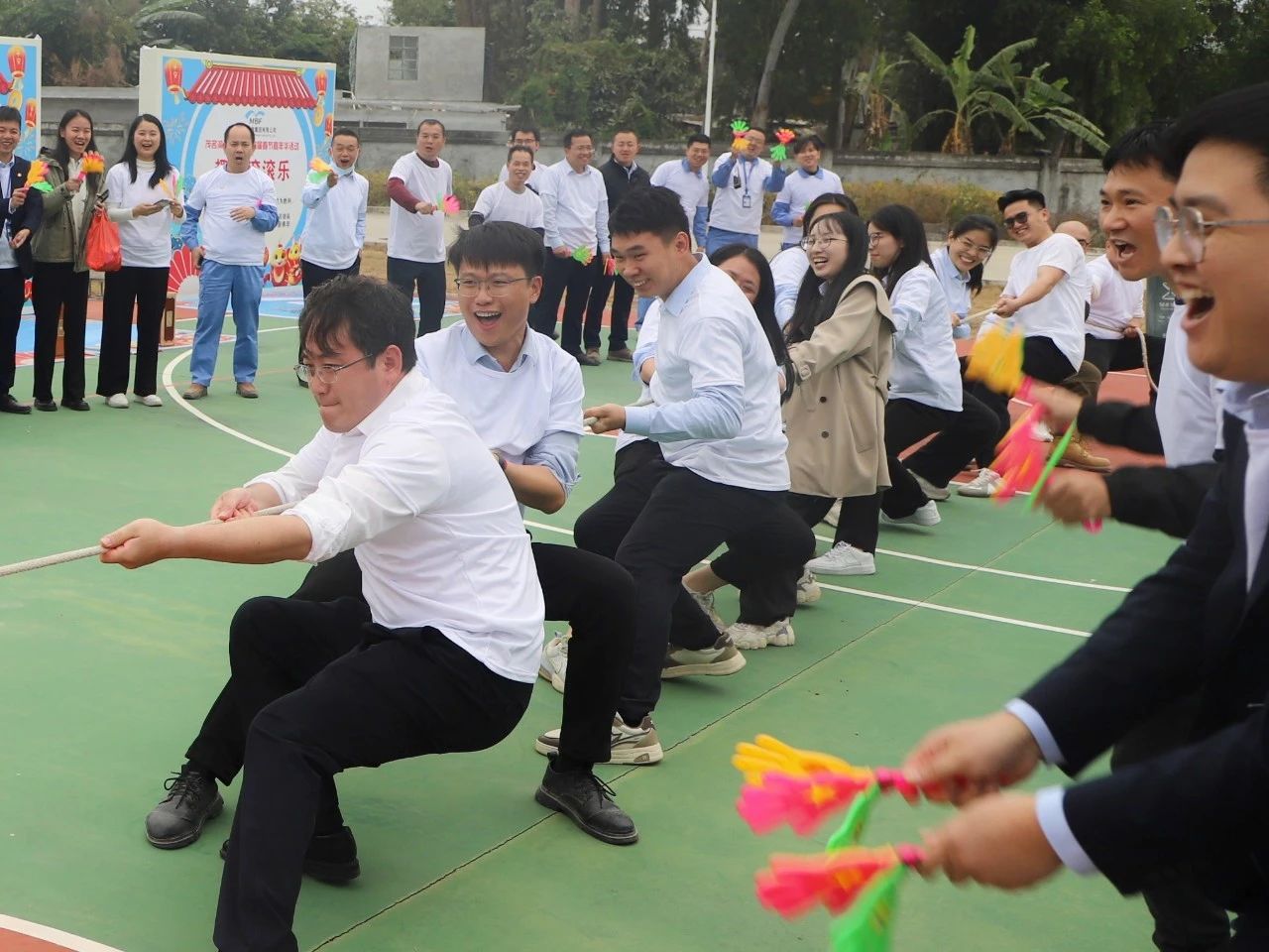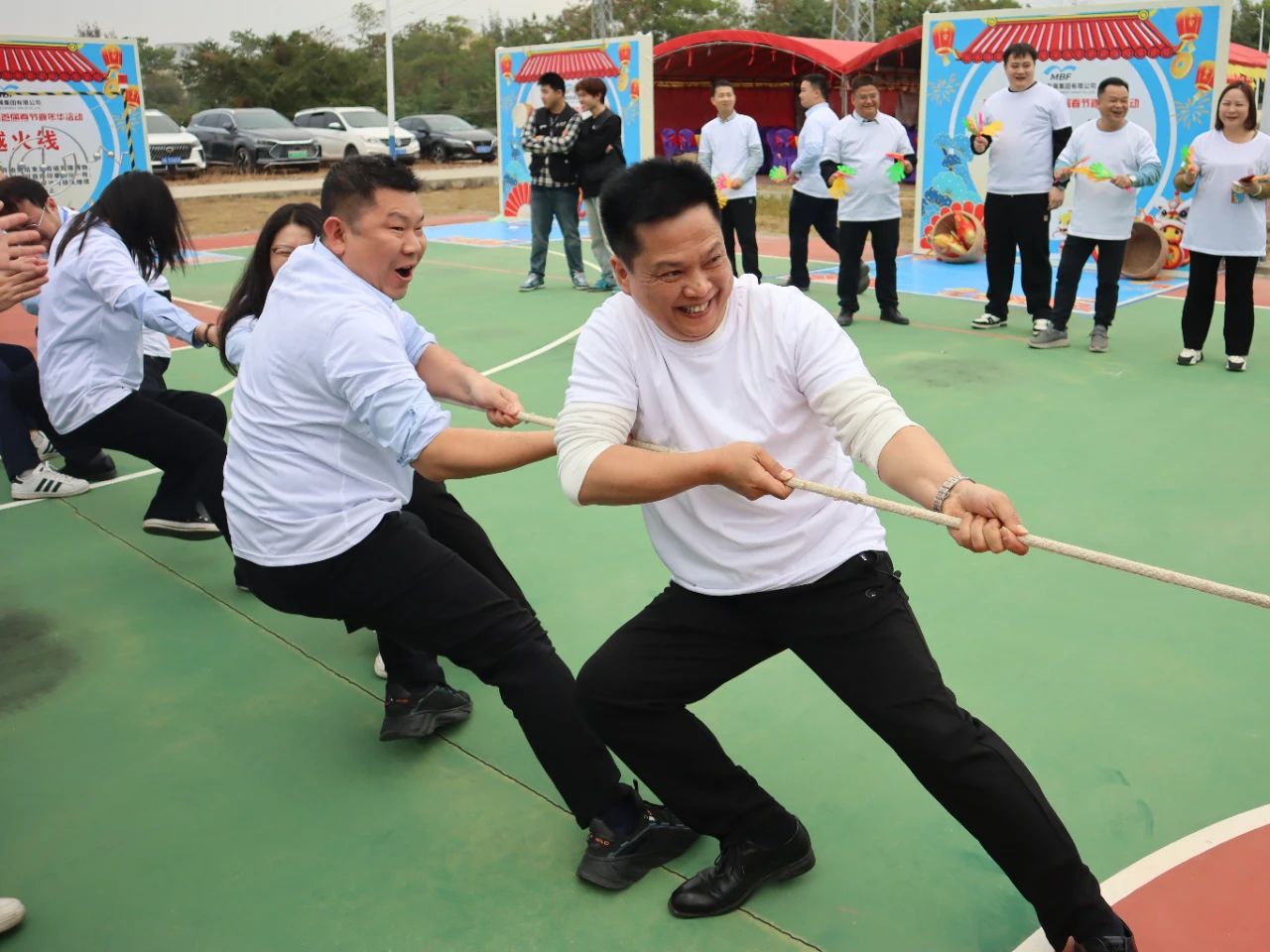 下午四時許,游園活動正式拉開帷幕。首先進行的是拔河比賽,由集團黨委書記、董事長呂崇君親自帶領集團領導班子輪番上陣,各部門代表踴躍參與,隨后是部門與部門之間自由角逐。現場中,拔河參賽隊員各就各位,扎好步、把好麻繩,當比賽的哨聲響起,雙手緊握長繩,憋足了勁拼命往后拉。“一二,加油;一二,加油”,現場啦啦隊員更是個個熱情高漲,紛紛在旁加油助威,吶喊聲、鼓掌聲、歡笑聲此起彼伏,精彩紛呈,賽場已然是一片歡樂的海洋。