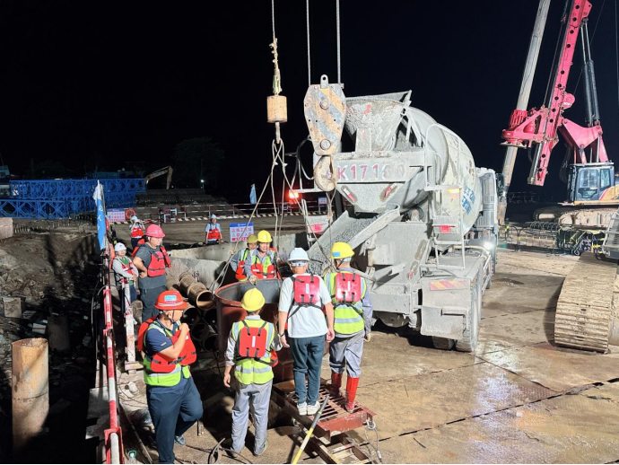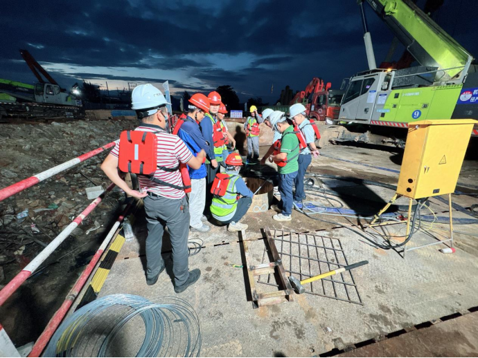 在施工現(xiàn)場,建設團隊嚴格依照標準化施工流程推進作業(yè)。從施打鋼護筒筑牢基礎防線,到旋挖機精準鉆孔;從初次清孔、鋼筋籠精準下放,再到安裝導管、二次清孔,直至完成水下混凝土澆筑,每一個環(huán)節(jié)都經(jīng)過精密測算與嚴格把控。過程中,建設單位園區(qū)公司、監(jiān)理單位、施工單位三方組成專項攻堅小組,全程駐守現(xiàn)場,通過技術交底、實時監(jiān)測、動態(tài)調整,全力確保澆筑過程萬無一失。
